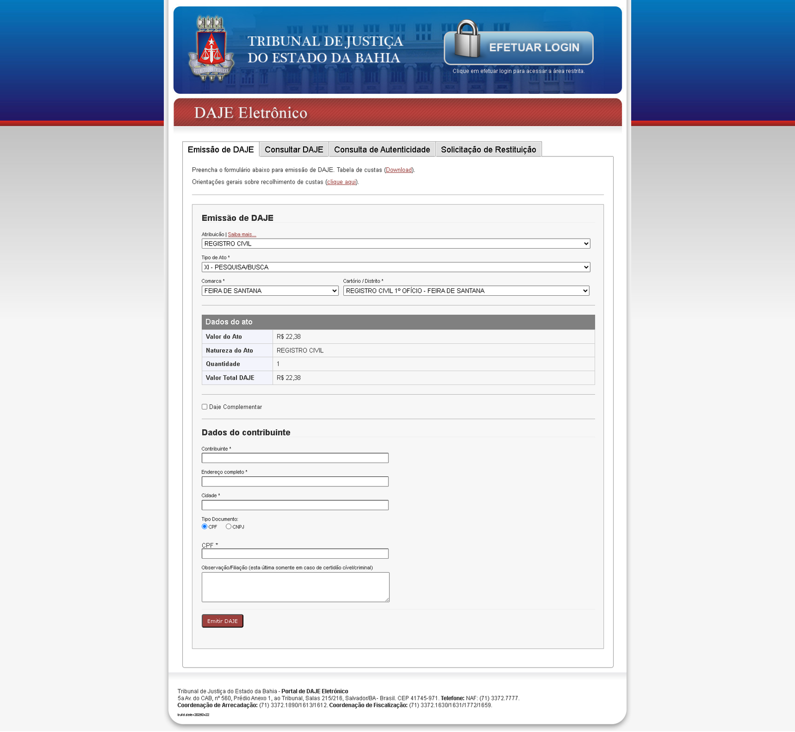 Para emitir o DAJE, o solicitante deve clicar no  botão (EMITIR DAJE) abaixo e preencher corretamente os campos solicitados pelo Tribunal de Justiça do Estado da Bahia.