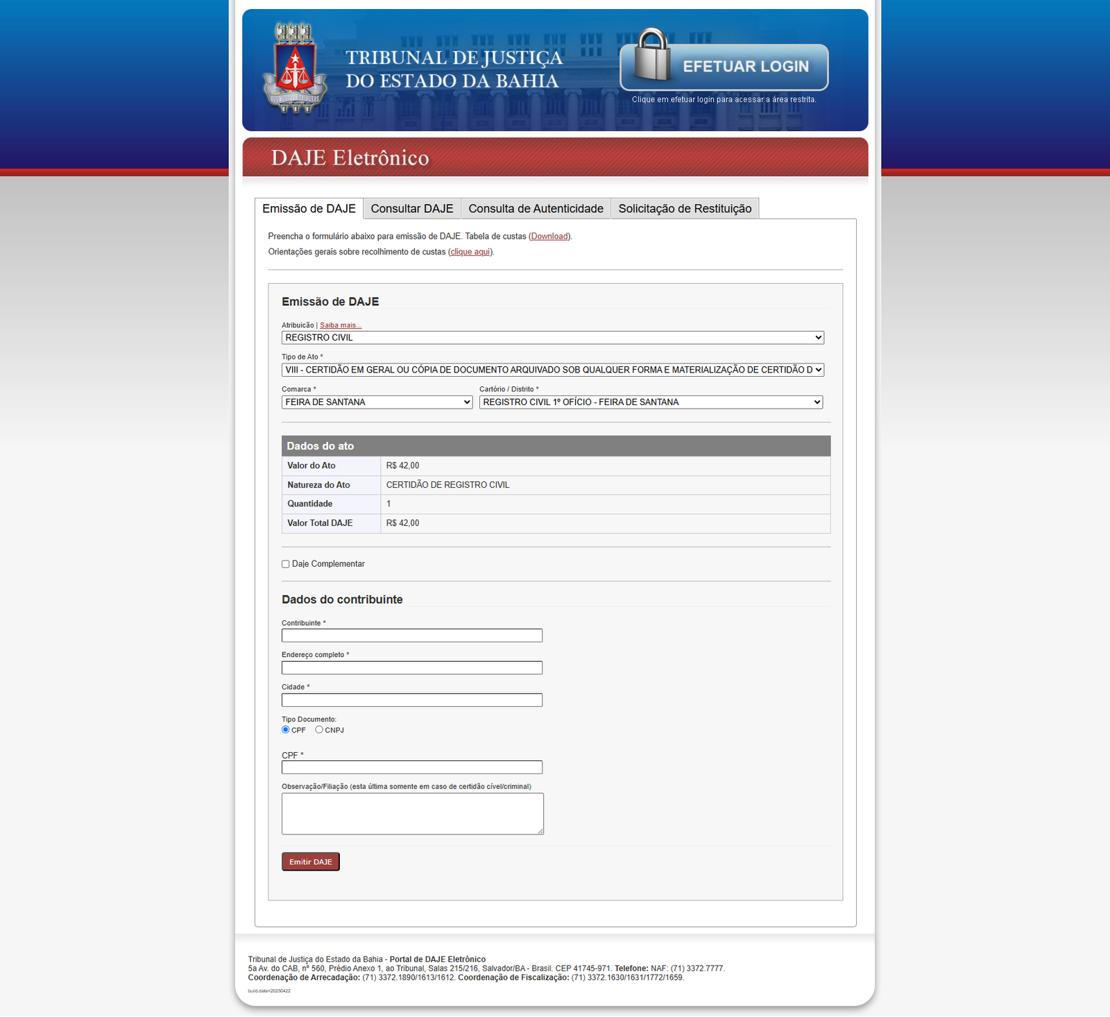 Para emitir o DAJE, o solicitante deve clicar no  botão (EMITIR DAJE) abaixo e preencher corretamente os campos solicitados pelo Tribunal de Justiça do Estado da Bahia.